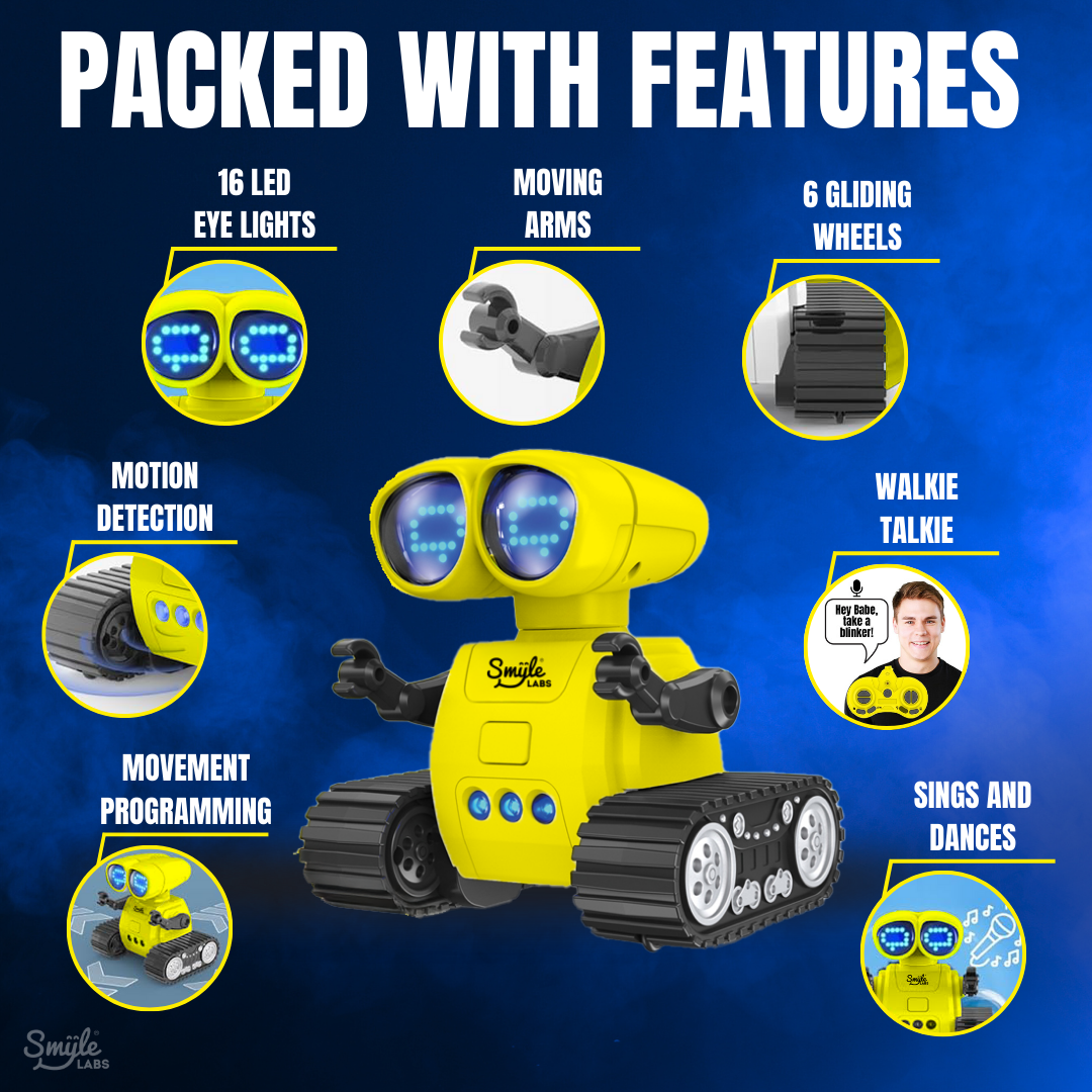 🤖 Bogaty w funkcje: Ruchome ramiona, oczy robota LED, ślizgające się kółka, robotyczne dźwięki, tryb walkie-talkie, wykrywanie ruchu & więcej.